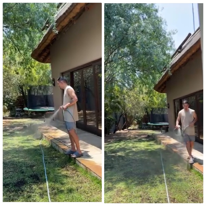 From the shared video on the popular platform, the former Mamelodi Sundowns attacking midfielder who pocketed a staggering R300 000 per month (R3,6 million per annum) during his playing days at the big spenders was captured watering his lawn which has bare patches in their backyard.